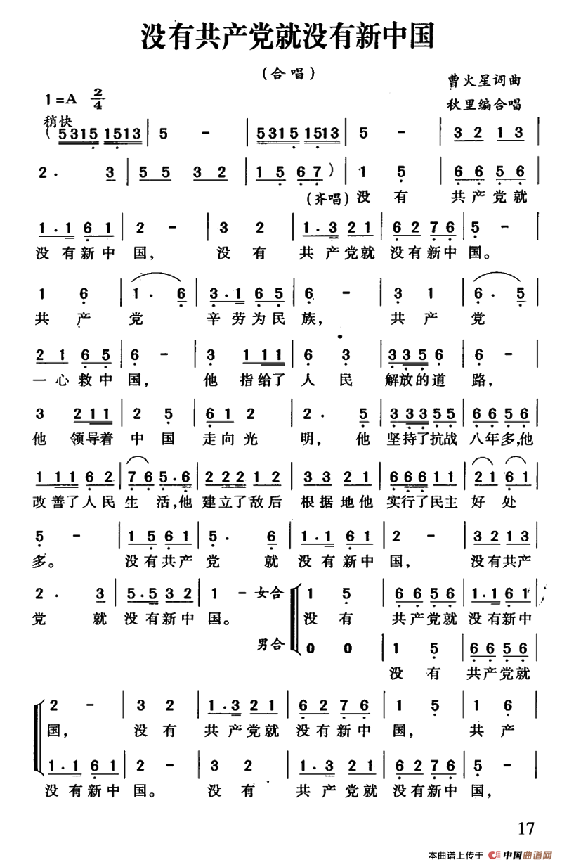 关于《没有共产党就没有新中国》曲谱的评论