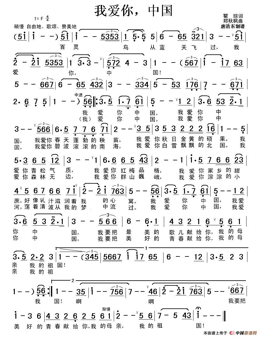 关于《我爱你中国》曲谱的评论