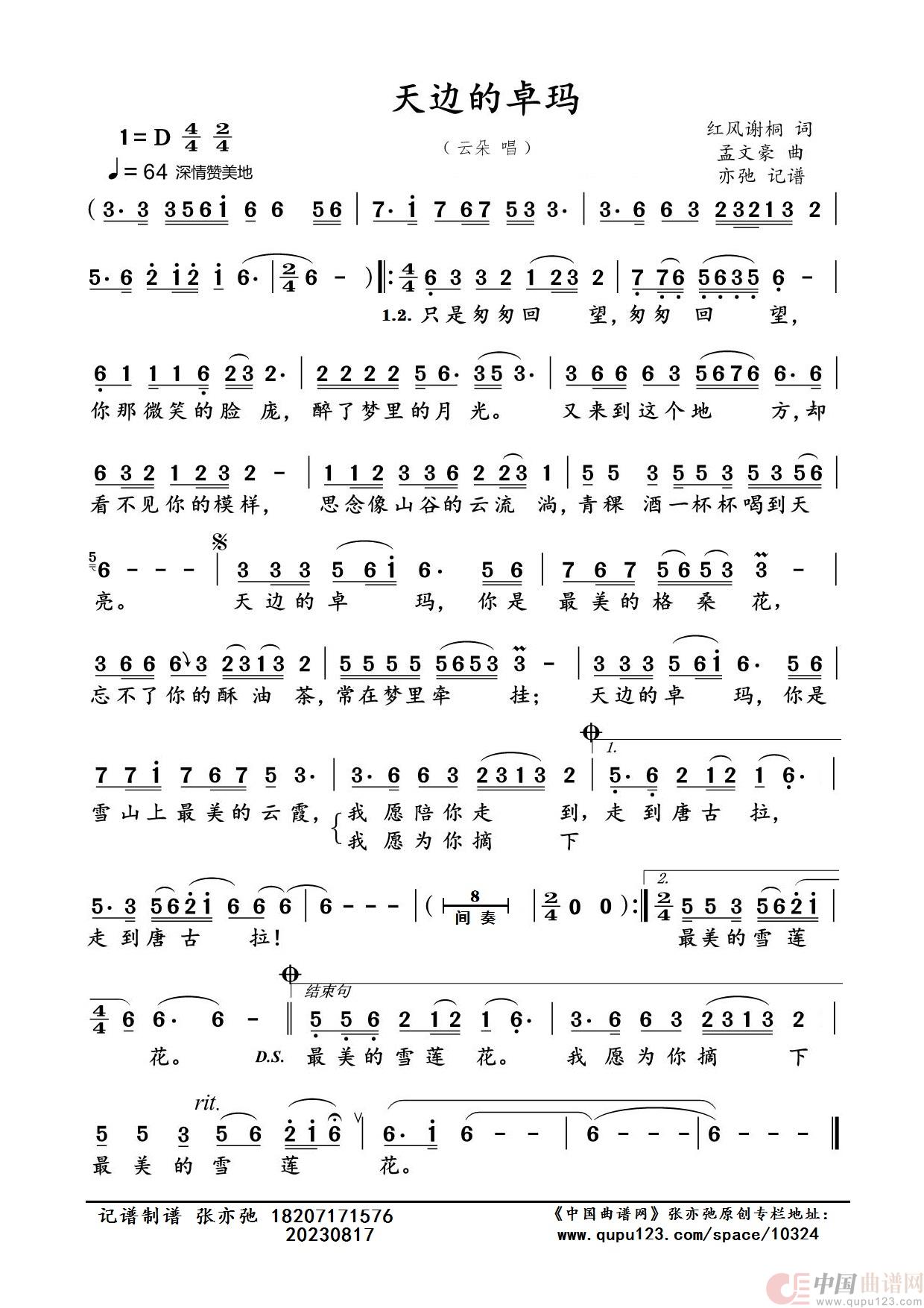 作词:红风谢桐   作曲:孟文豪   演唱(奏):云朵   来源:张亦弛 记谱制谱   上传:咪迷米张亦弛   日期:2023-08-17   浏览次数: