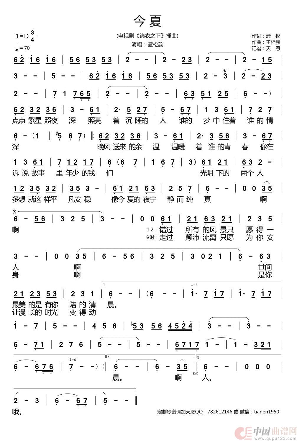 曲谱:今夏((电视剧《锦衣之下》插曲))