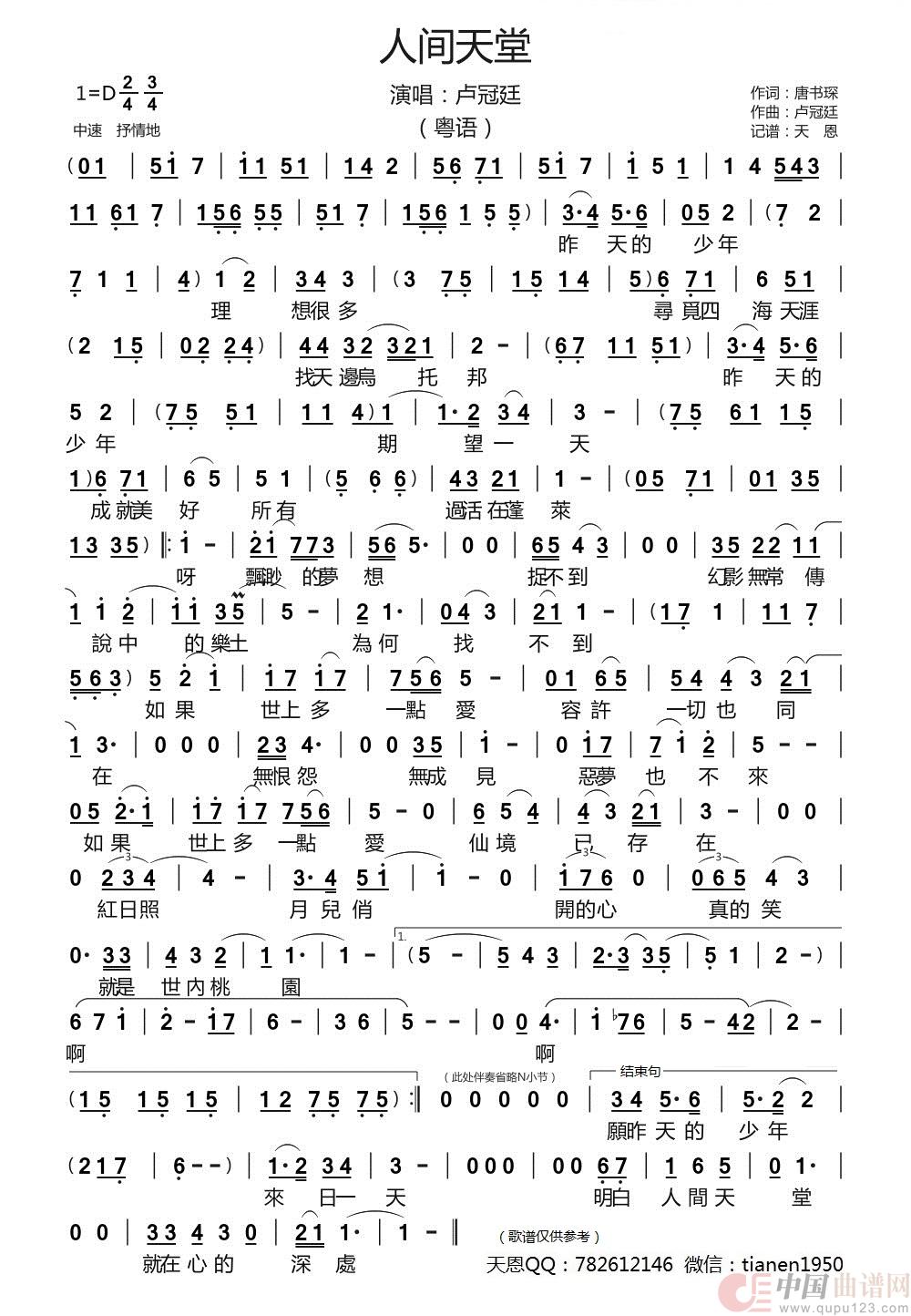 曲谱:人间天堂(粤语版)