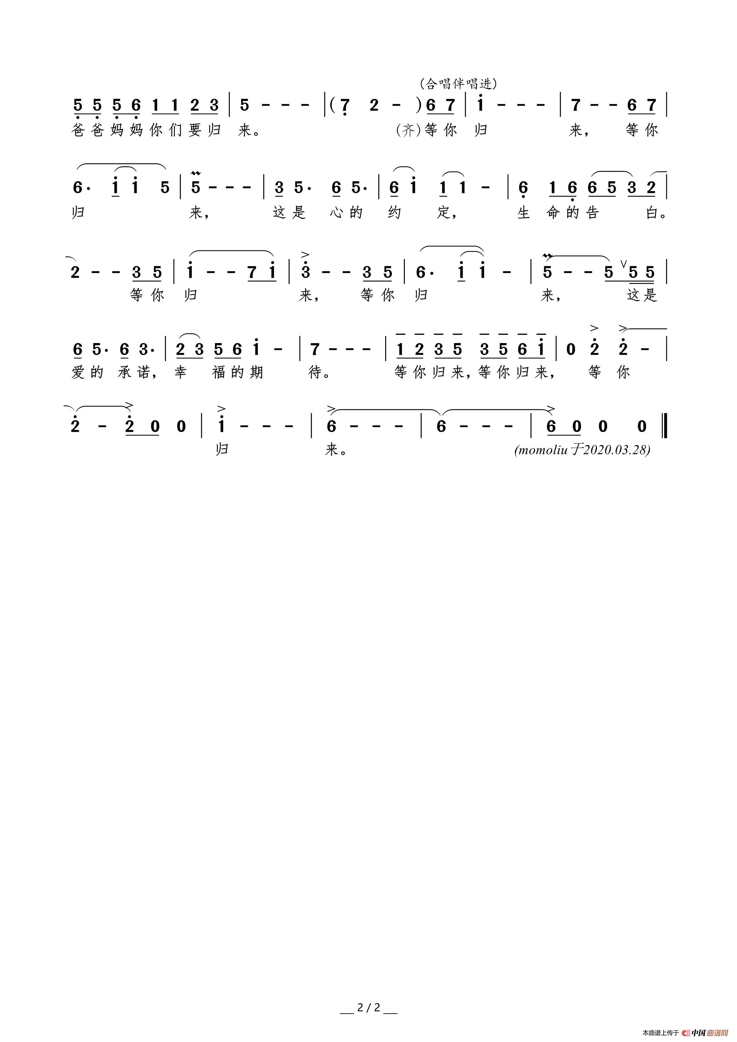 关于《等你归来》曲谱的评论