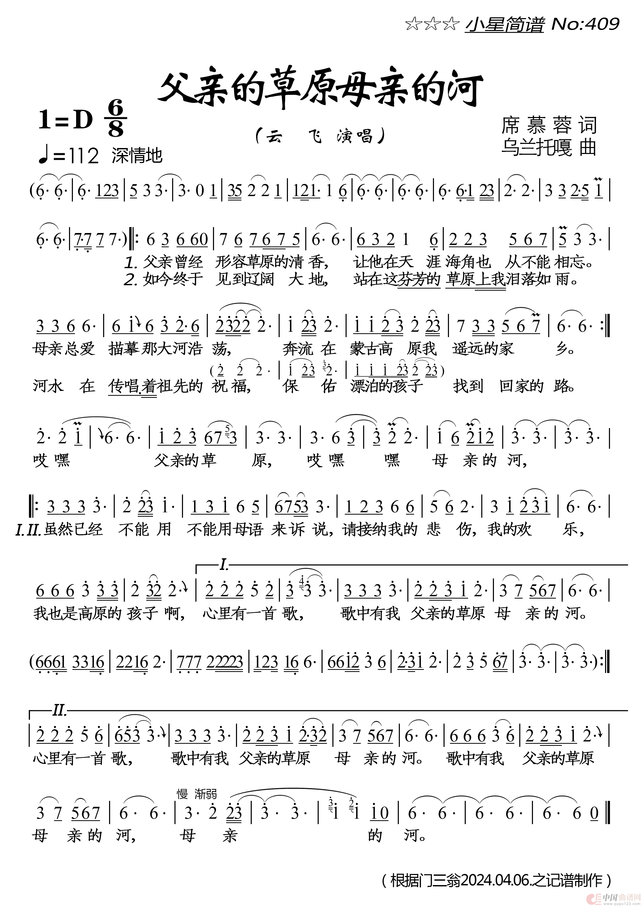 关于《父亲的草原母亲的河》曲谱的评论