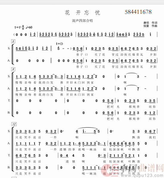 花开忘忧混声四部 合唱谱(厦门爱歌)