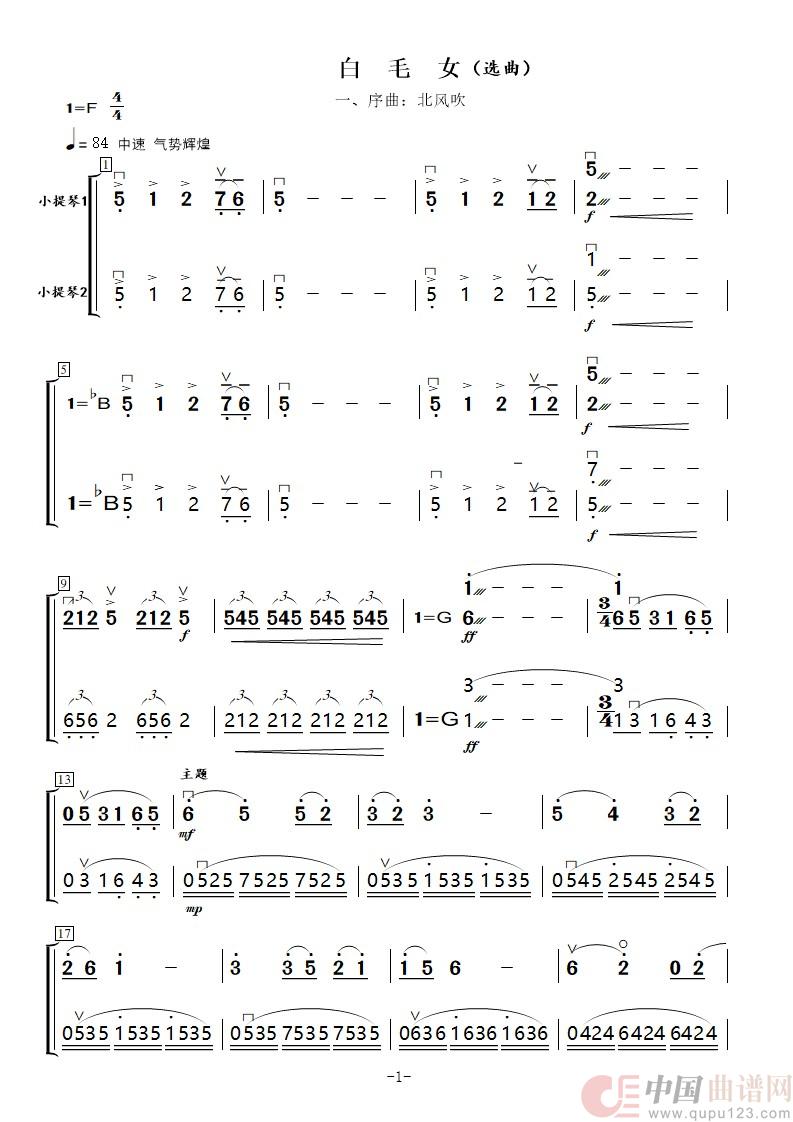 现代舞剧《白毛女》选曲(弦乐二重奏(简谱))