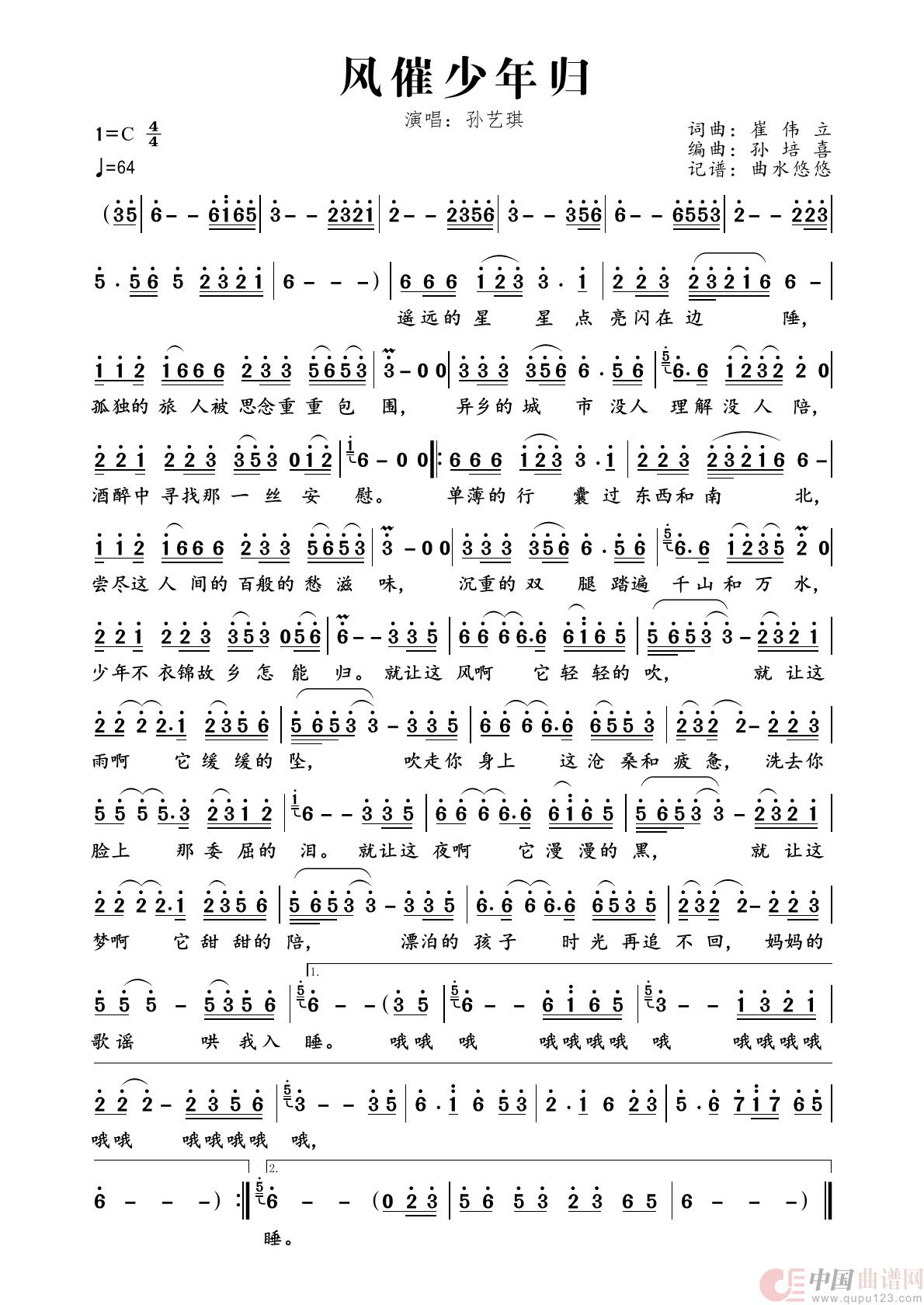 关于《风催少年归》曲谱的评论