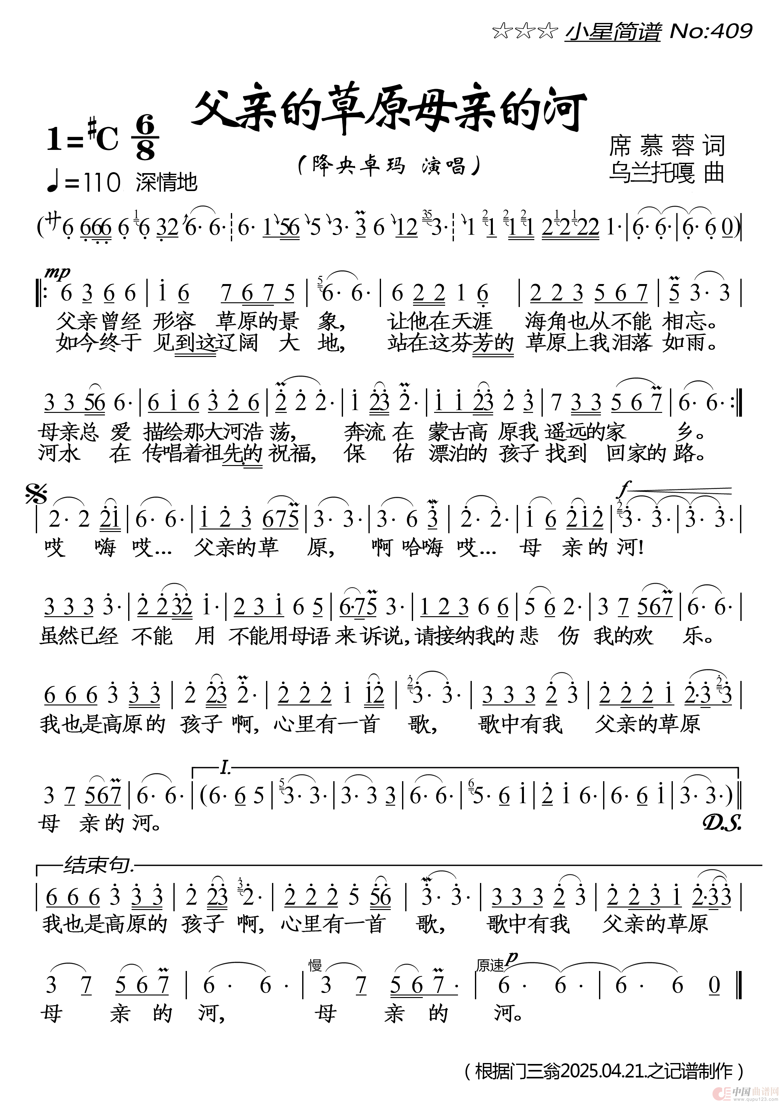 关于《父亲的草原母亲的河》曲谱的评论