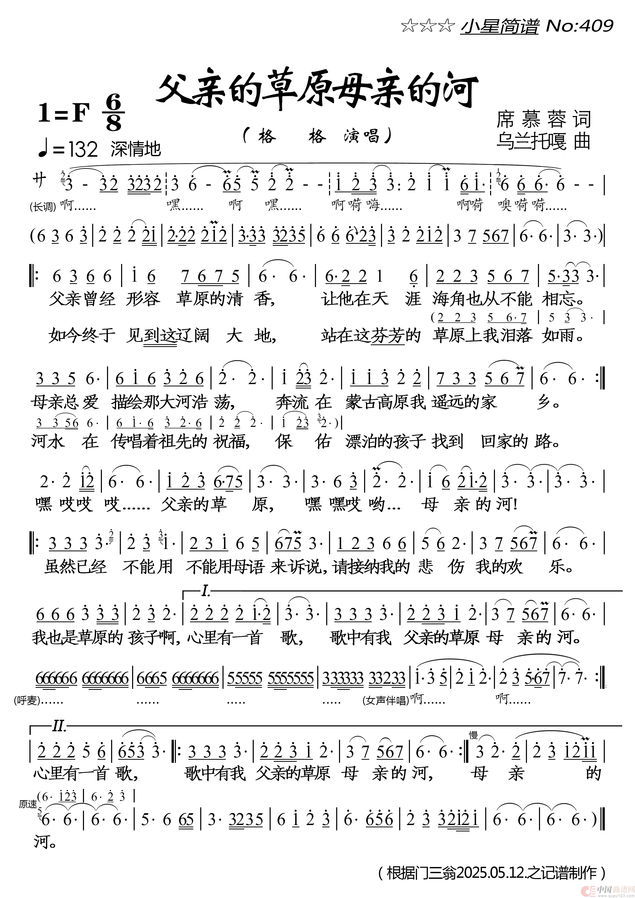关于《父亲的草原母亲的河》曲谱的评论