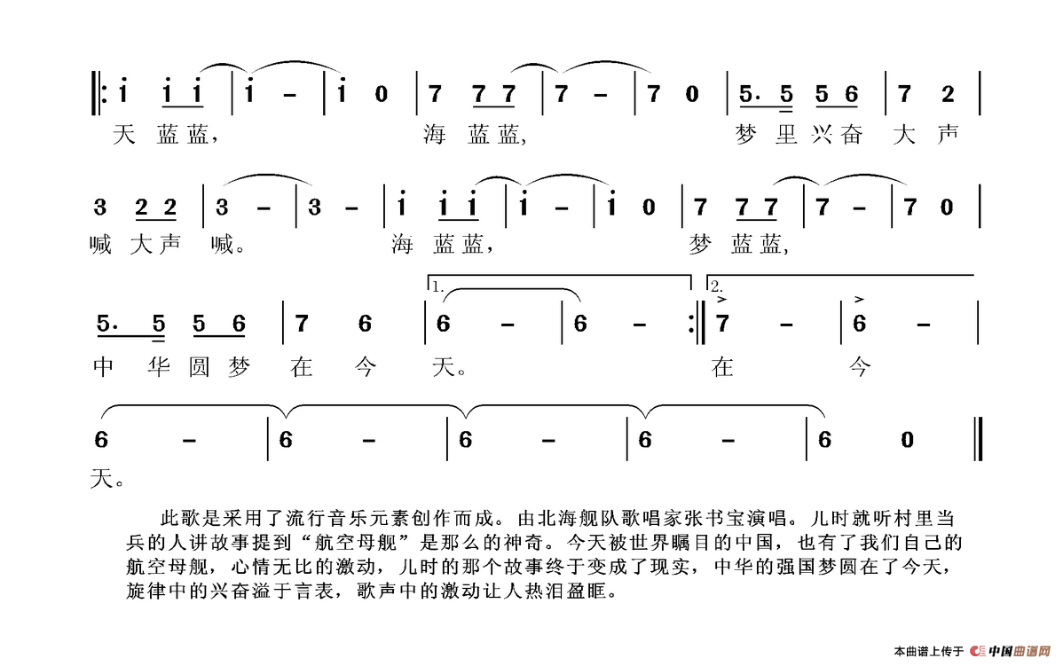 天蓝蓝,海蓝蓝, 梦里兴奋大声喊。海蓝蓝,梦蓝蓝, 中华圆梦在今天。中华圆梦在今天。