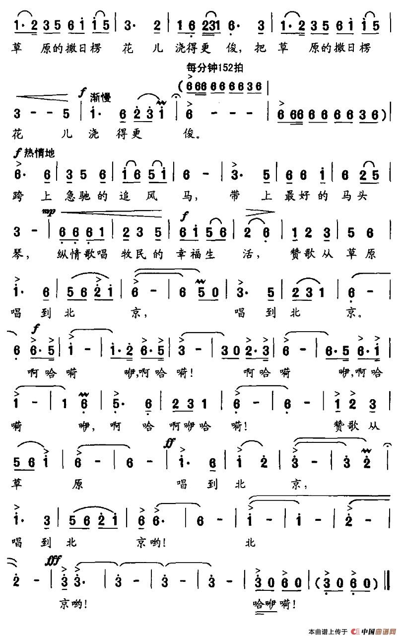 纵情歌唱牧民的幸福生活,赞给从草原唱到北京,唱到北京。啊……