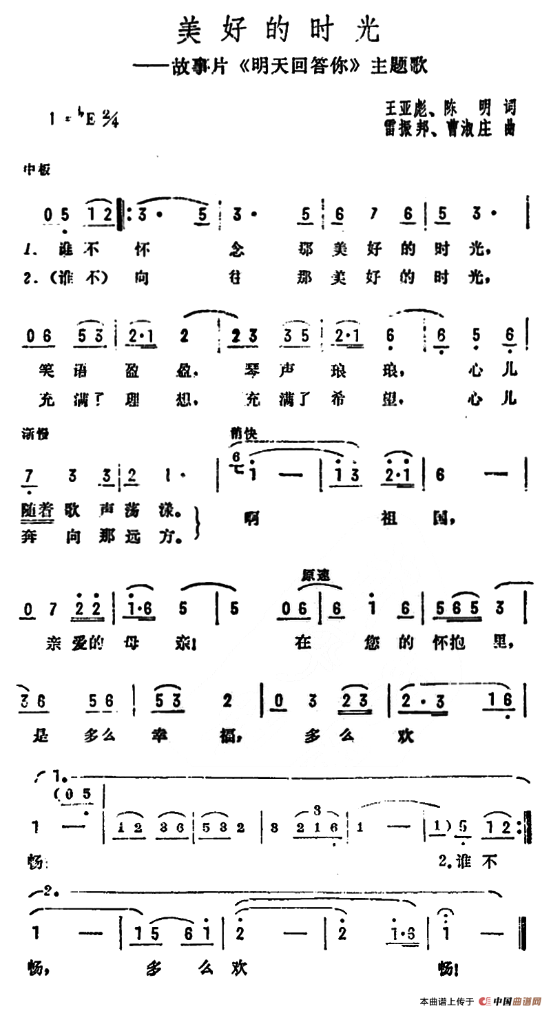 作词:王亚彪、陈明 作曲:雷振邦、曹淑庄 来源:《中国曲谱网》 上传:秋叶起舞