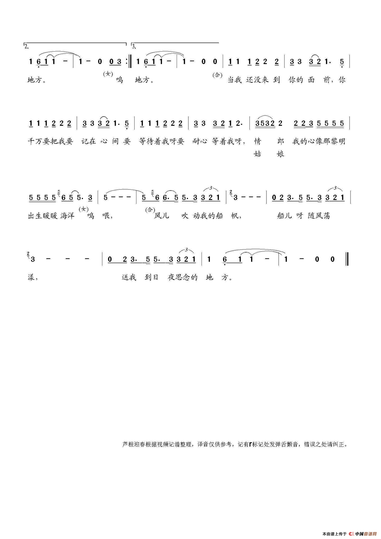 哈里、杨钰莹演唱印尼民歌《船歌》,柔和亲切、优美动人,由芦根迎春根据KTV视频记谱译音上传。