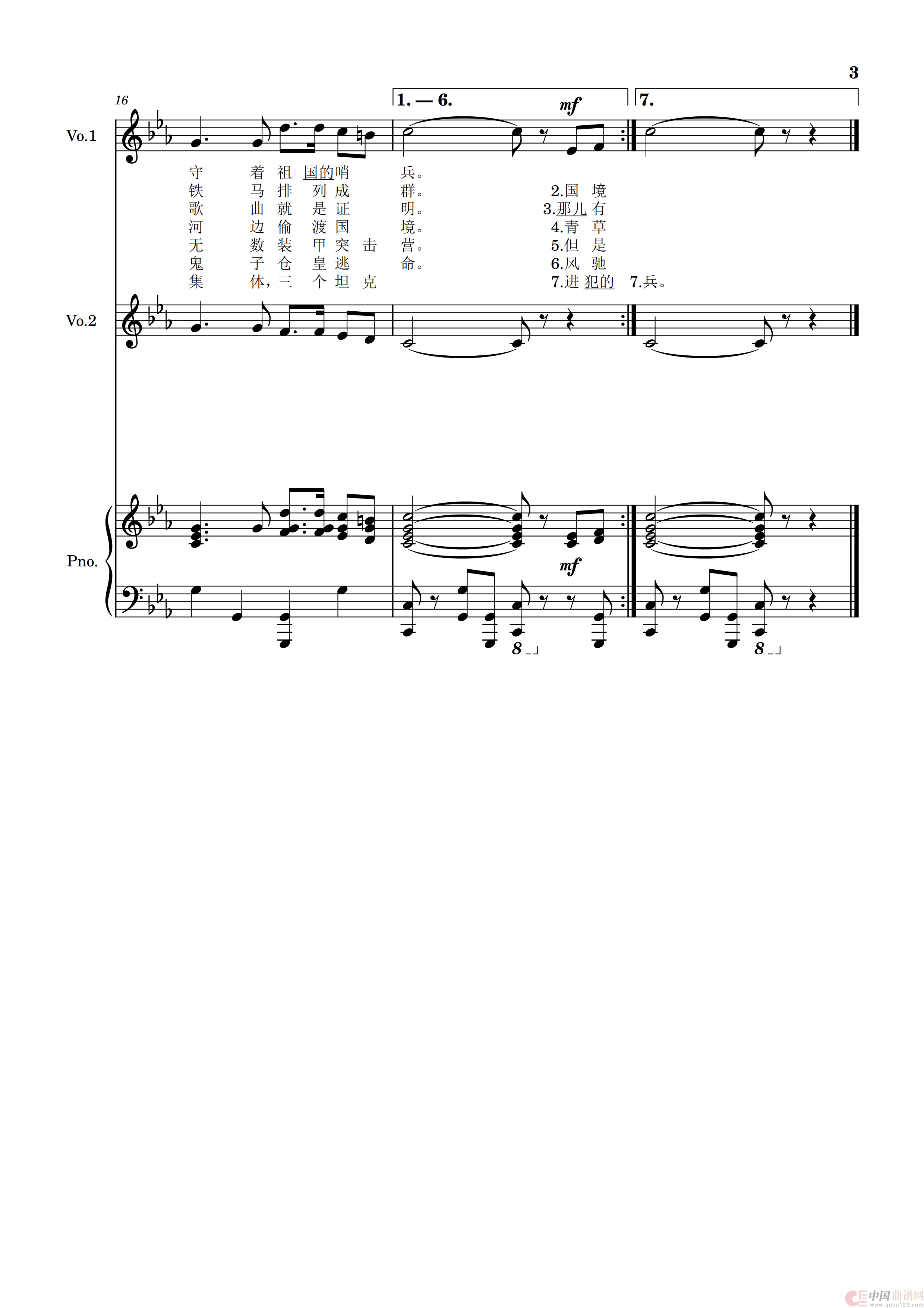 三个坦克兵(二声部合唱五线谱,含钢琴伴奏)