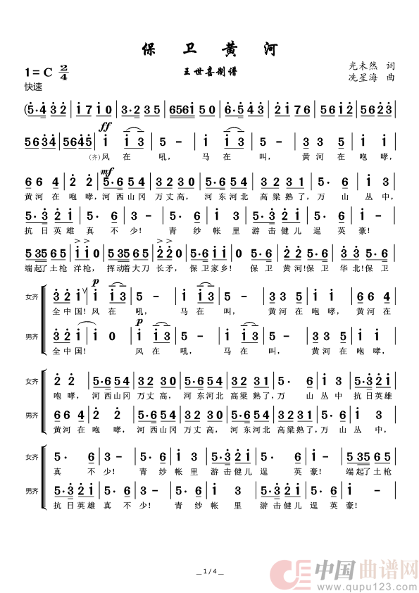 本曲谱根据歌曲《保卫黄河》由王世喜改编成三声部合唱曲,王世喜制谱,忻州市体育公园中老年合唱团演唱完成。