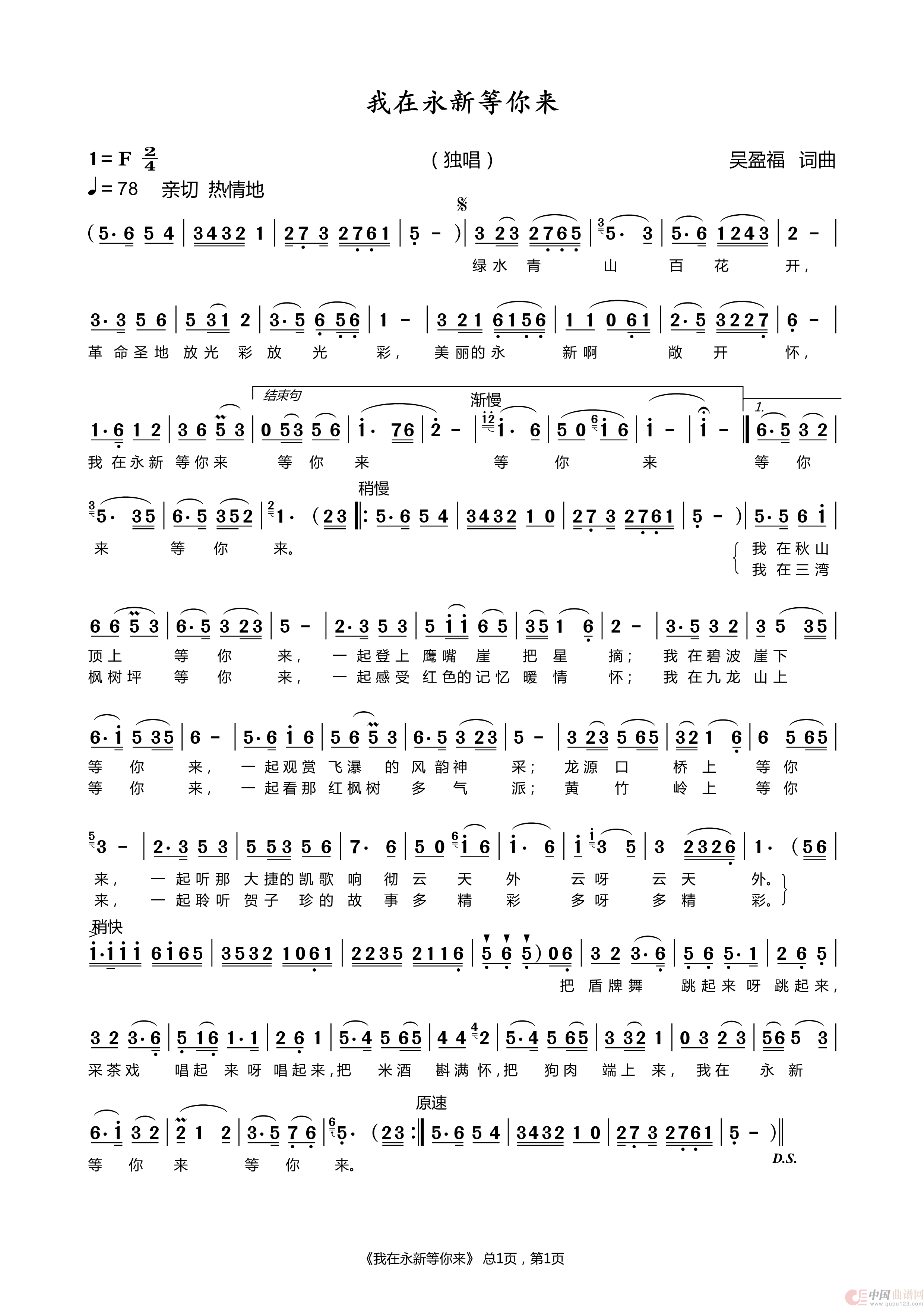关于《我在永新等你来》曲谱的评论