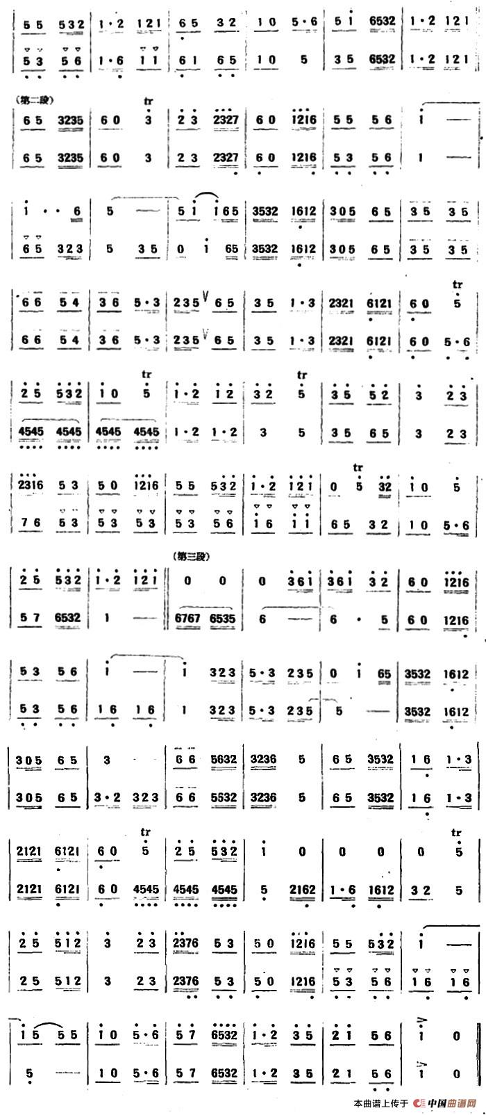 乐曲由主题和它的五次半变奏构成,以支声复调织体为主,结合对位的运用,形成了你高我低、你繁我简、此起彼伏、连绵不断的艺术效果。用梆笛与曲笛重奏,使音区、音色、技法上各有特点,对比鲜明,是山东民间乐曲的一大突破。在演奏手法上应兼具梆笛和山东地方戏曲“柳子戏”中曲笛的特点,使活泼跳动、热烈激情与清新饱满、圆润流畅相结合,体现山东笛曲的独特风格。