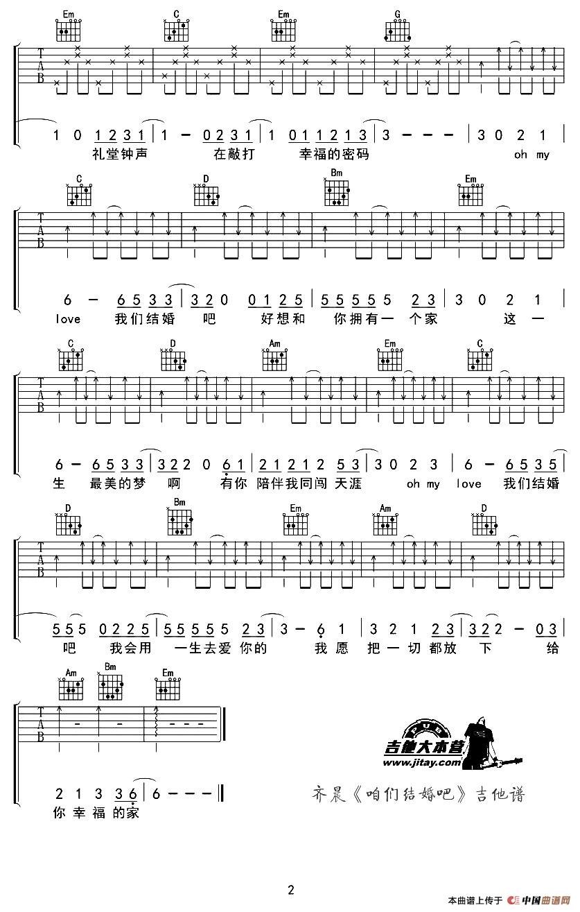 齐晨的《咱们结婚吧》吉他谱,一首浪漫时尚曲风的告白歌曲。我们曾经迷失也曾彷徨,在恋爱的旅途遭遇风雨,是彼此的相依相伴让一路坎坷开成了烟花灿烂美景如画, 此刻只想对你说”咱们结婚吧“。愿天下有情人终成眷属,在这首求婚歌曲里,感受甜蜜浪漫。