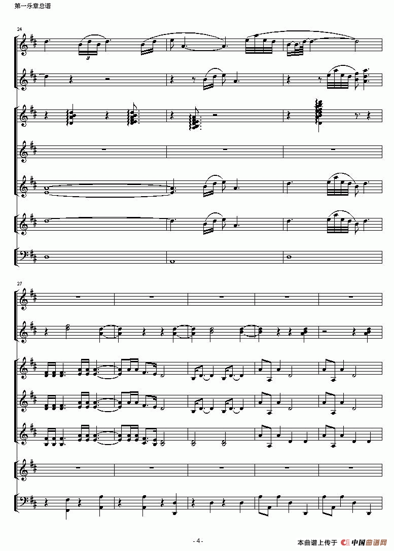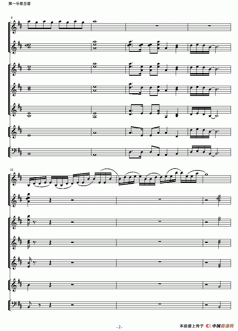 第一乐章 竹林畅游:共分7段:魏晋风云、千里命驾、翠叶飒飒、竹林畅游、吟诗作赋、俚曲醉歌、夕阳归途。分别描述了魏晋时期政权更迭、战乱频仍的险恶形势,嵇康等人在竹林畅叙、吟诗、饮酒、放歌等活动,表达出隐士们真挚的情谊、朋友相聚的欢乐、不愿与恶势力合作的清高、报国无门的无奈。