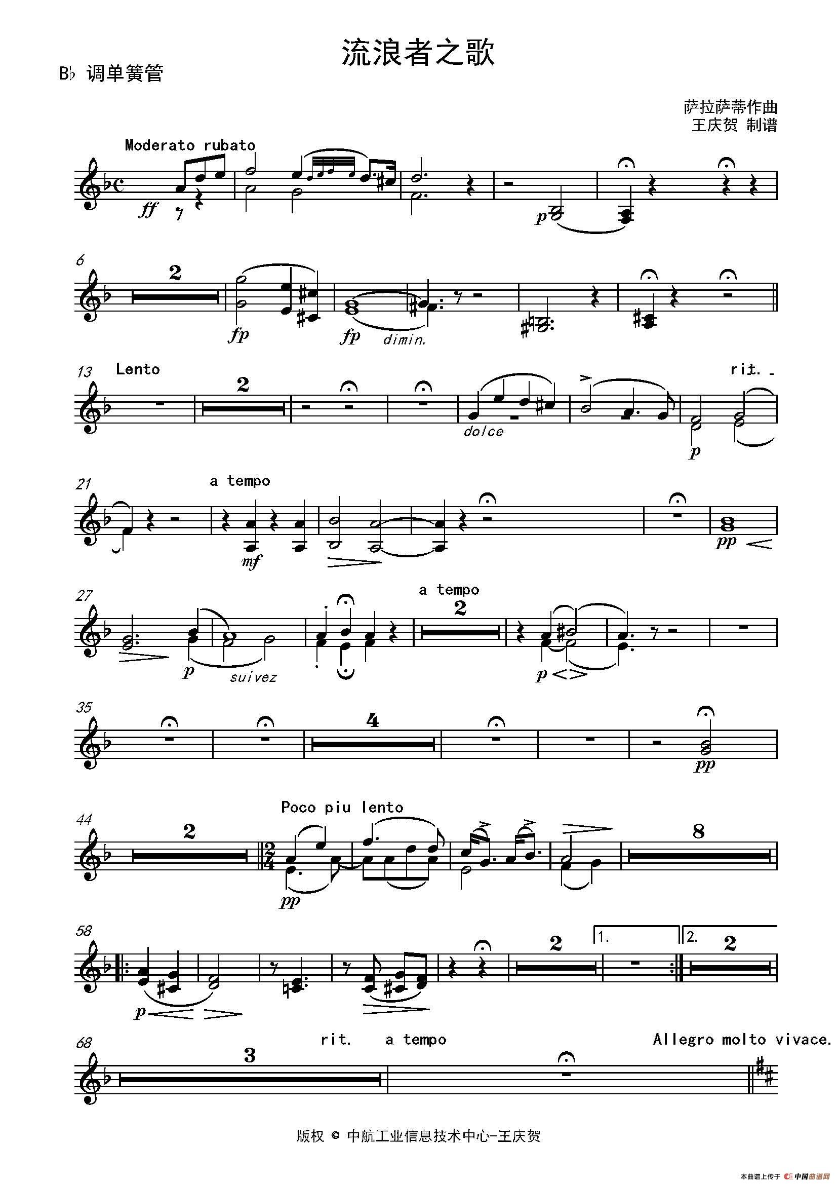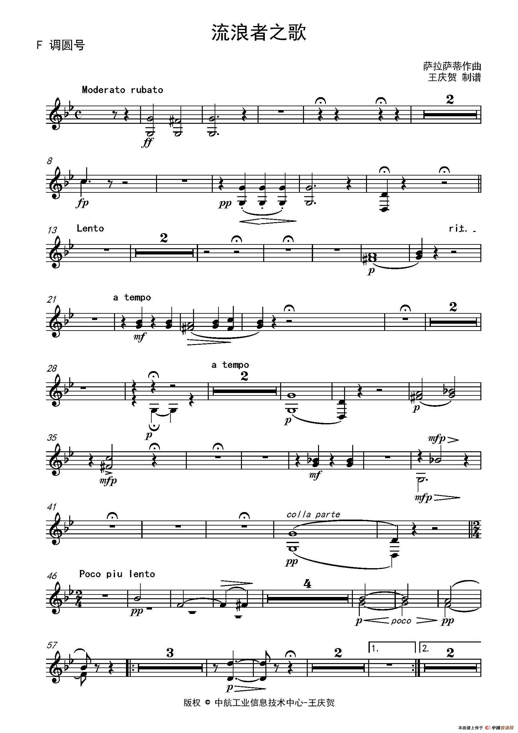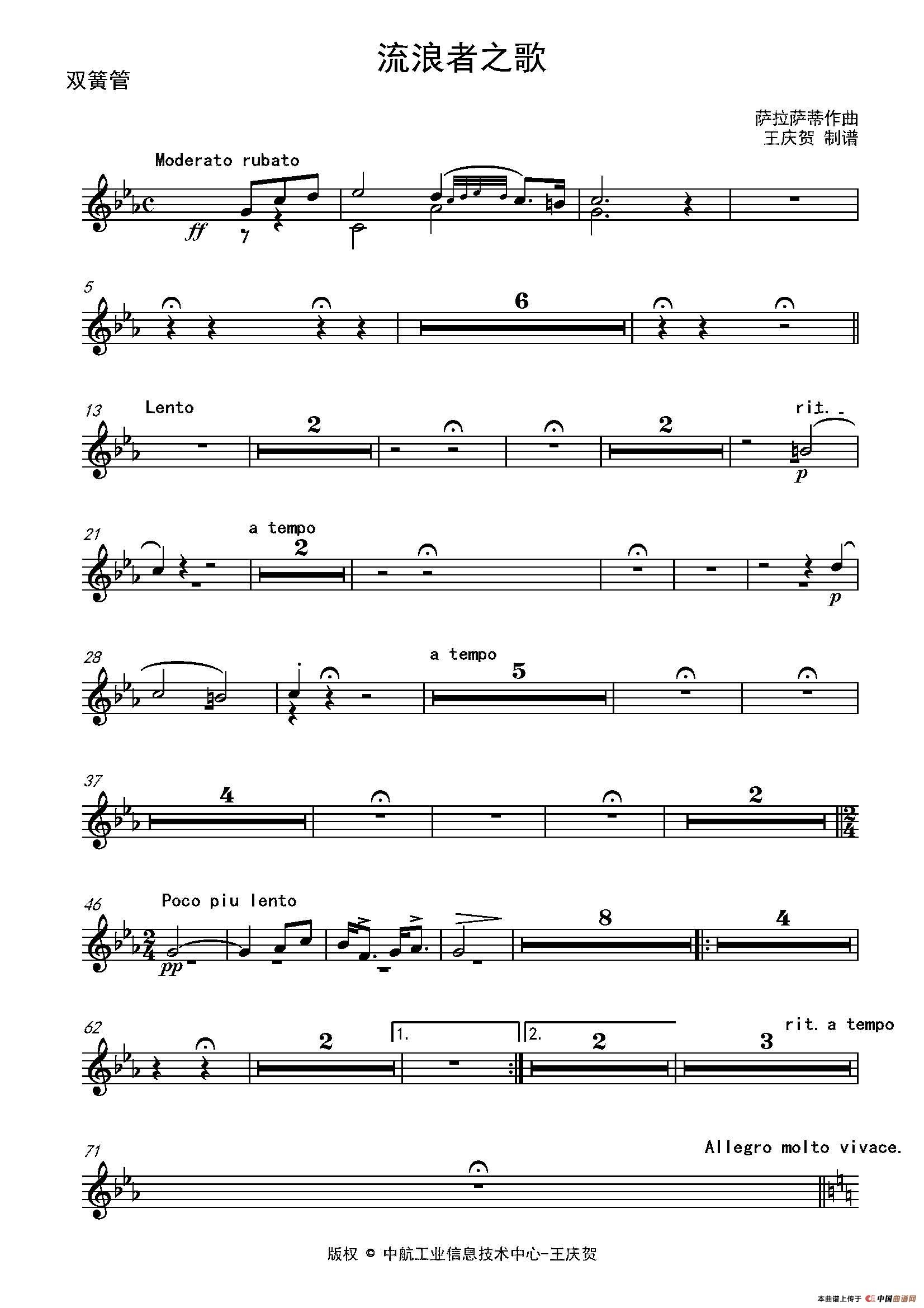 萨拉萨蒂的流浪者之歌,又称吉普赛之歌,在借鉴了老版油印曲谱后,将其中一些声部的乐器移调并更改了部分符号后重新排版,pdf是完整总谱+分谱,大学毕业后从事软件开发工作手头没有乐队了,分享给各位喜欢的朋友,仅供学习交流用途,不得用于商业目的,喜欢交流乐谱制作的朋友可以加我QQ:631199652,若有错误请不吝赐教。