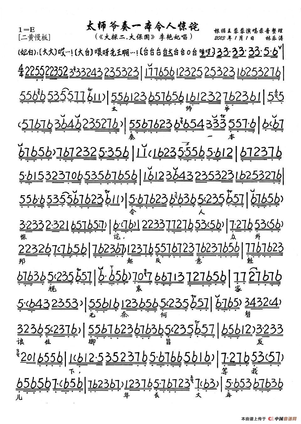 太师爷奏一本令人惊诧(《大探二·大保国》李艳妃唱段、琴谱)
