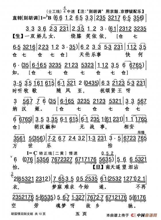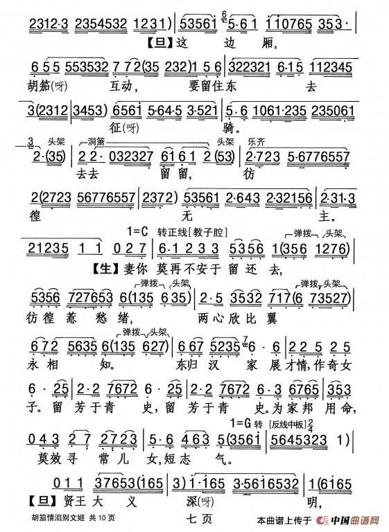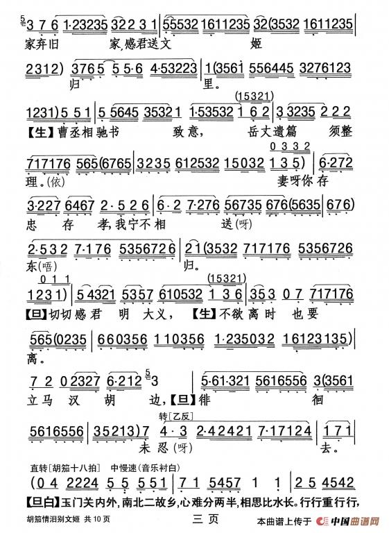 昨日鱼鸿传讯息,一腔悲喜唱胡笳,岂为新家弃旧家,感君送文姬,归里。(生唱)曹丞相驰书致意,岳丈遗篇须整理,妻你存忠存孝,我宁不相送,东归。(旦唱)切切感君明大义,(生唱)不欲离时也要离,立马汉胡边,(旦唱)徘徊,(乙反)未忍去。(旦楔白:玉门关内外,南北二故乡,心难分两半,相思比水长。行行重行行,只见旗幡招展,贤王我夫,这是什么所在? 生:这是接汉亭。乃是胡汉两邦接壤之地,军士在此,列队恭送文姬贤妻,你别胡归汉呀。旦:哦!接汉亭么?唉!正是一亭非举处,前尘十二年呀)!
