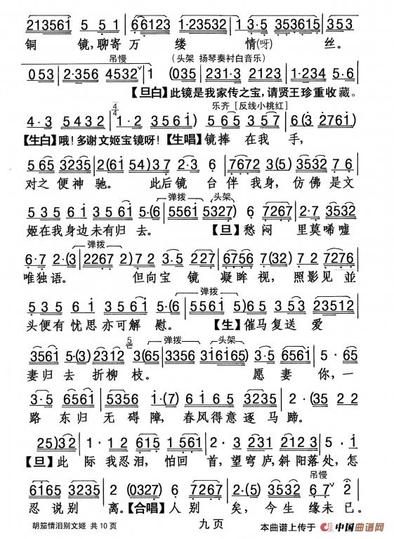 贤王大义深明,文姬此心安矣,此后南天北地,魂梦夜夜,相依。(生唱)隔山隔水不隔心,春花秋月总关情,塞雁去来,传厚意。(旦唱)他日儿女长成时,教子莫忘汉家母,春晖应无尽,骨肉,永难离。(生唱)殷殷子女情,悠悠父母恩,一线沉沉,牵两处。(旦唱)分袂临岐,重逢何日,持赠一方铜镜,聊寄万缕,情丝。(旦:此镜是我家传之宝,请贤王珍重收藏。生:多谢文姬宝镜呀)。