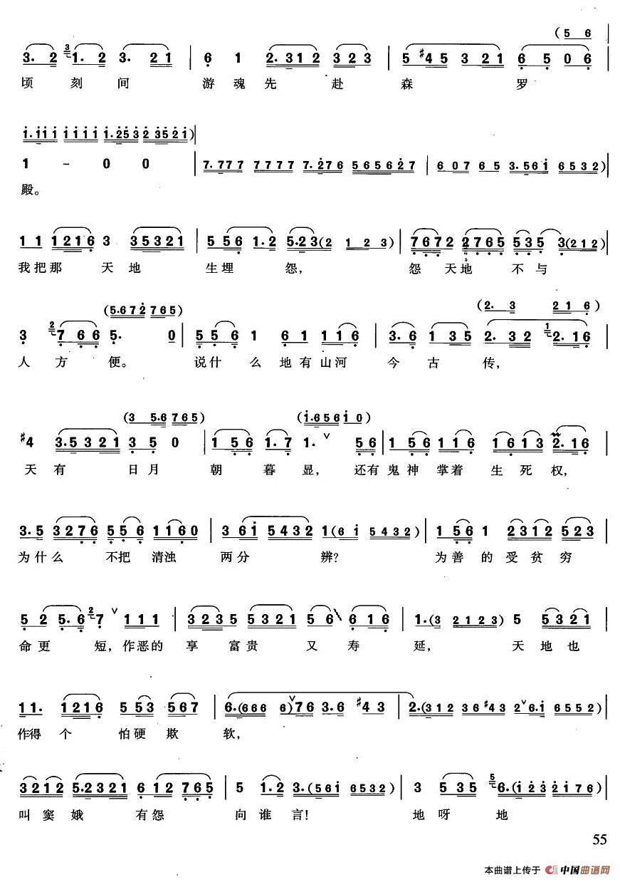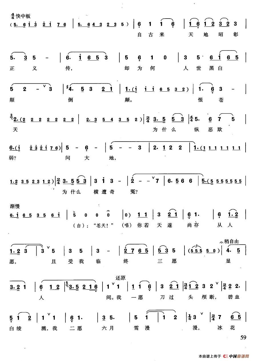 窦娥:没来由犯王法,不提防遭刑宪。叫声屈动地惊天,顷刻间游魂先赴森罗殿。我把那天地生埋怨,怨天地不与人方便。说什么地有山河今古传,天有日月朝暮显。还有鬼神掌着生死权,为什么不把清浊两分辨。为善的受贫穷命更短,做恶的享富贵又寿延。天地也作得个怕硬欺软,叫窦娥有冤向谁言。地呀地,不分好歹何为地。天啊天,你错勘愚贤枉作天。求大哥慢步向前,只因为浑身痛酸。前街里去心怀恨,后街里去死无怨,休推辞路远。可怜我孤身一人无亲眷,爹娘嘛……三岁上我娘亲身亡将儿丢,七岁时爹爹往京城把官求。我抵债到蔡家作媳妇,谁知晓成婚不久夫短寿。我满希望侍奉婆婆终天年,又谁知无端大祸又临头。想必是我八字儿生来一世愁,谁似我无尽头。想必是我前世里烧过断头香,今世里招祸尤。念窦娥渺渺幽魂转仙去,不能伴你到百年。再不能与婆婆提茶送饭,再不能与婆婆浆洗缝连。从今后望婆婆要节哀顺变,永保安康福寿绵绵。声声冤字字血动地惊天,屈死的窦娥目难瞑心不甘饮恨九泉。自古来天地昭彰正气传,却为何人世黑白颠倒颠。问苍天为什么纵恶欺善,问大地为什么妄造奇冤。苍天……你若天道尚存从人愿,且受我临终三愿显人间。我一愿刀过头颅断,碧血白幡溅。我二愿六月雪漫漫,冰花滚似棉。我三愿从此甘霖断,山阳旱三年。不是我罚下这等无头愿,这都是官吏们无心正法,叫百姓有冤难辩。浮云为我阴,悲风为我旋。一桩桩誓愿都实现,才把我屈死的窦娥冤魂显。