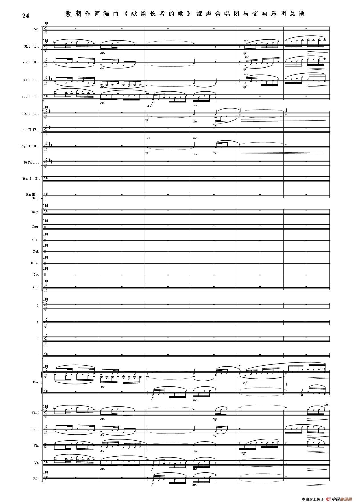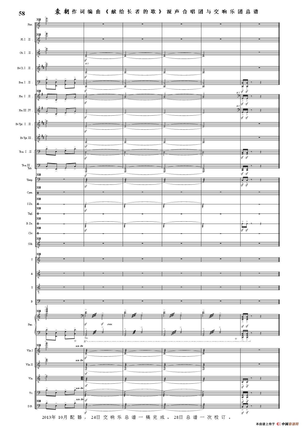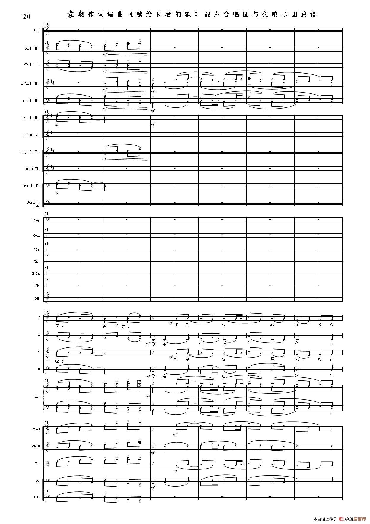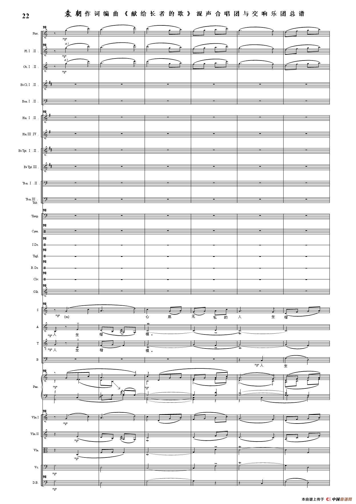 (三)这里发表的是《献歌》的混声合唱与交响乐团总谱,连接的音频也是从制谱软件提取的混声合唱与交响乐团的音频,不是音乐会实况录音。因而只能听合唱音色而不能听见歌词。抱歉!