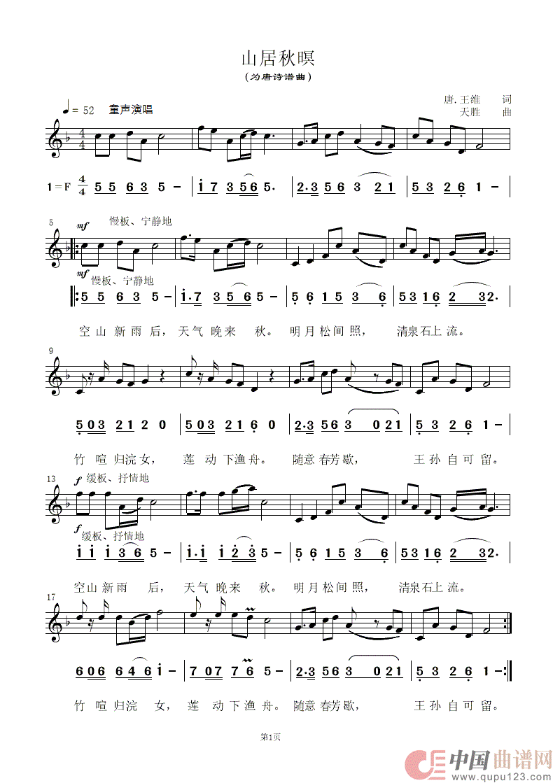 关于《山居秋暝(为唐诗谱曲)》曲谱的评论