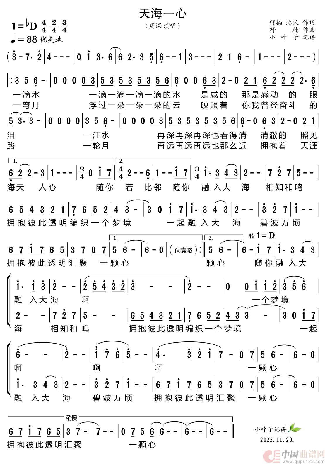 天海一心(配和声简谱)