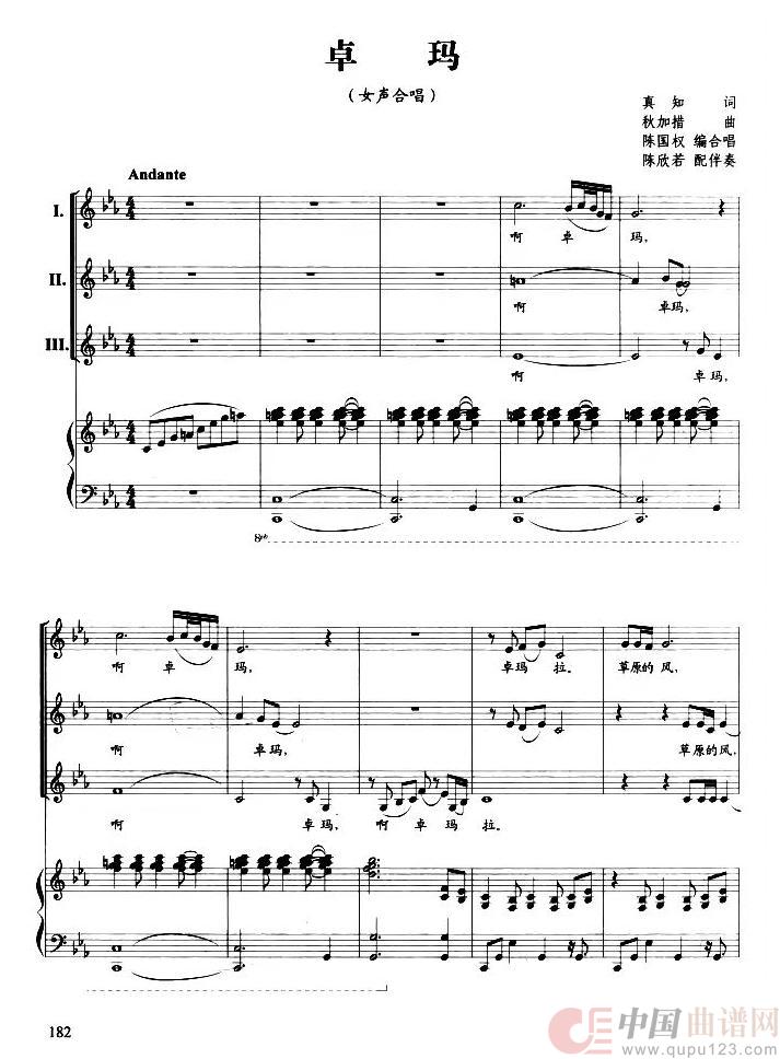 卓玛(三声部合唱线谱、陈国权编合唱)