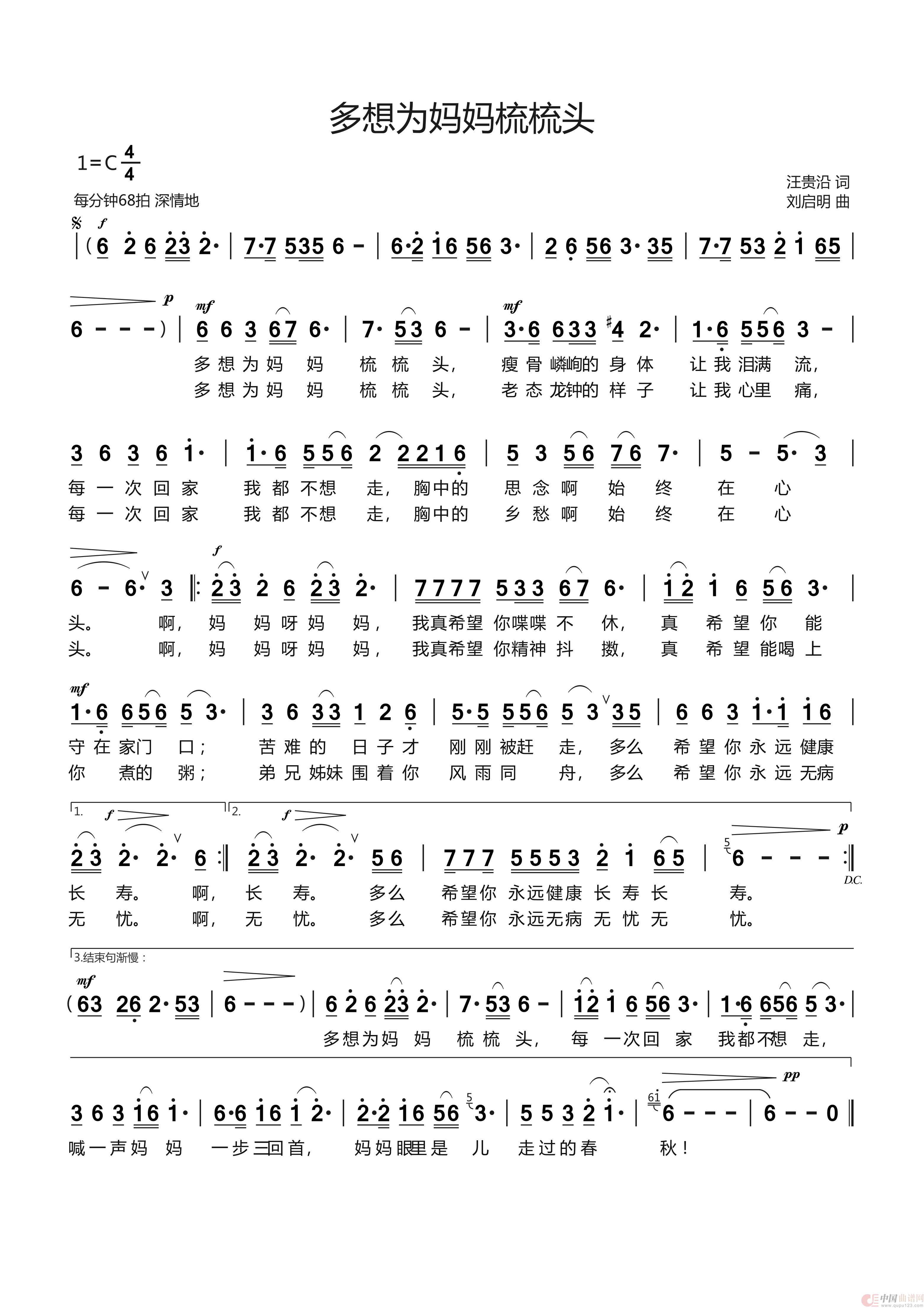 关于《《多想为妈妈梳梳头》 汪贵沿词 刘启明曲 崔来宾唱》曲谱的评论