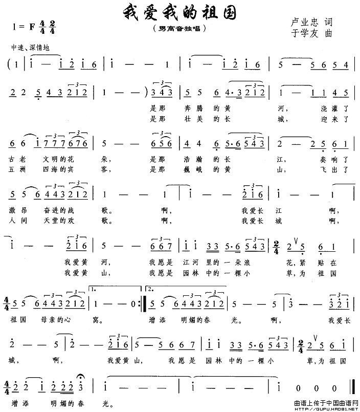 曲谱:我爱我的祖国(卢业忠词 于学友曲)