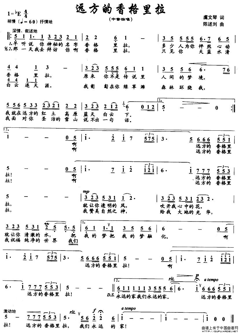 曲谱:远方的香格里拉(虞文琴词 陈述刘曲)