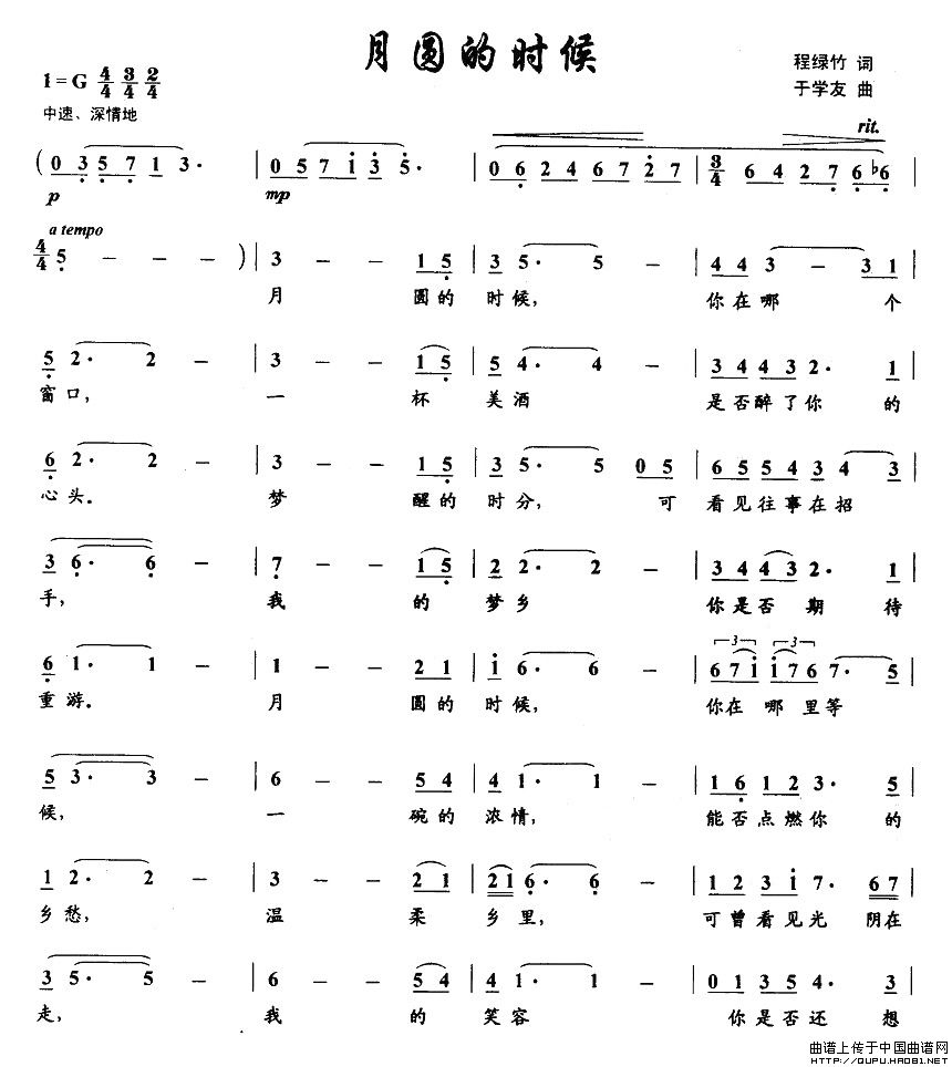 曲谱:月圆的时候(程绿竹词 于学友曲)
