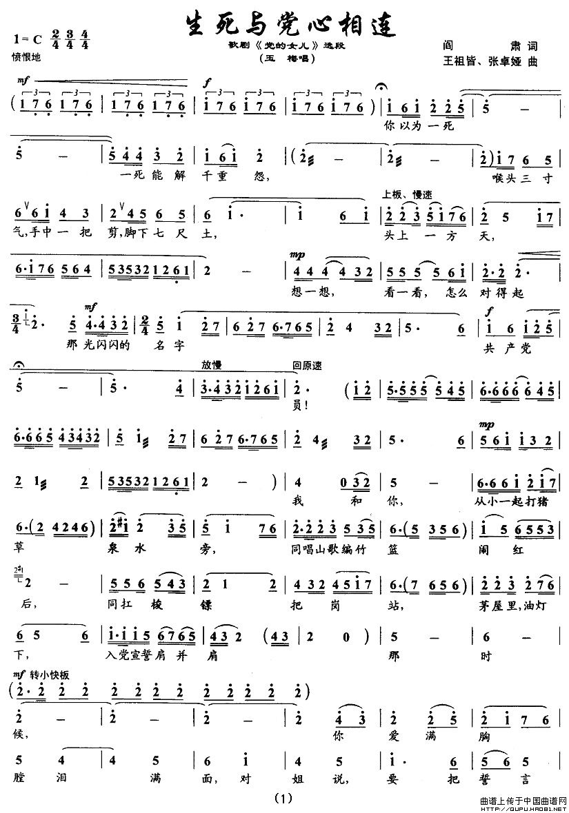 曲谱:生死与党心相连(歌剧《党的女儿》田玉梅唱段)