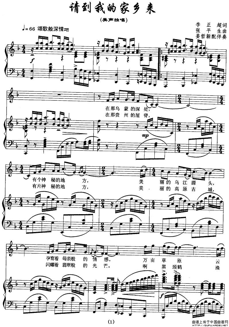 曲谱:请到我的家乡来(李正超词 张平生曲、正谱)