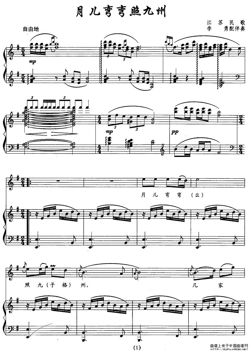 曲谱:月儿弯弯照九州(江苏民歌 、正谱)