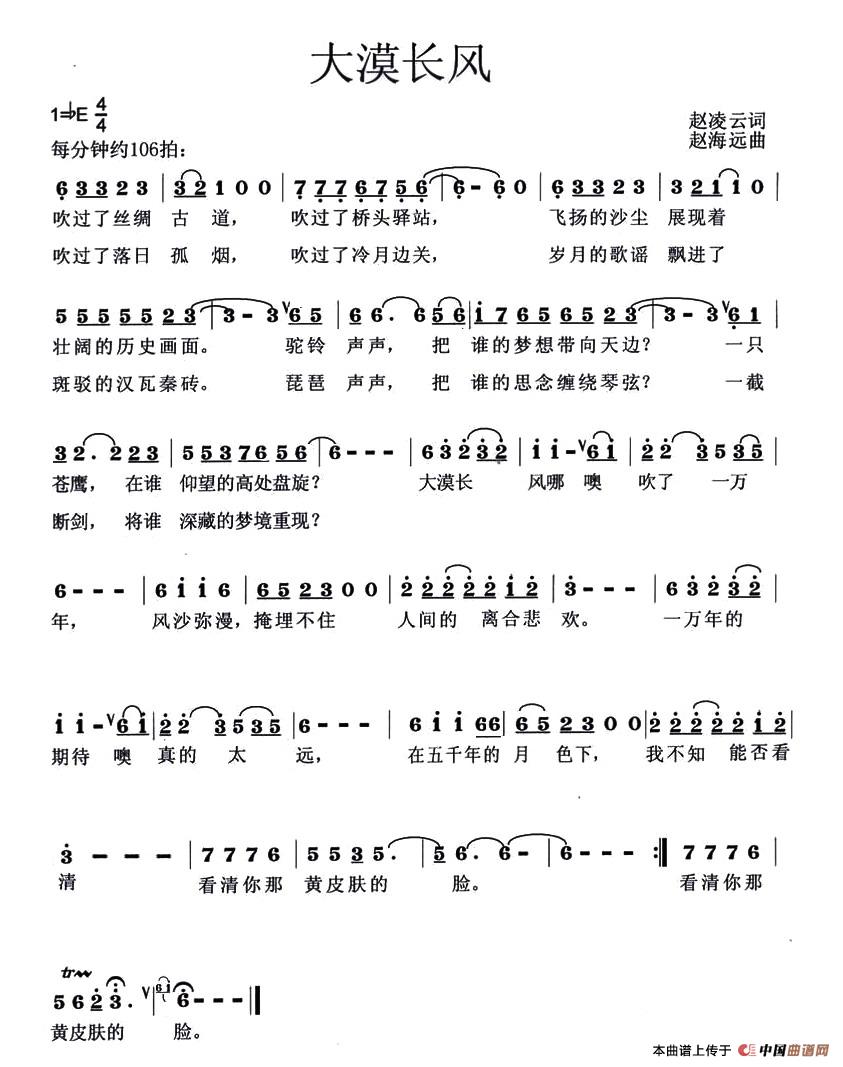《大漠长风》由赵凌云作词,赵海远作曲,赵虎演唱。该作品词曲中饱含着历史的凝重与沧桑之感,旋律大气恢弘,优美动听。歌曲通过大漠长风这条主线,牵引出古老的丝绸之路,表达了人们对远古历史的追忆和怀念,也展现了中华儿女共筑中国梦的豪情。
