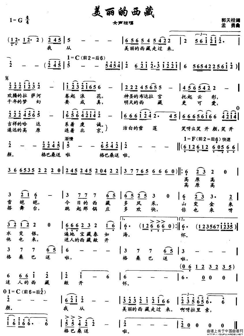 曲谱:美丽的西藏(郭天柱词 孟勇曲)