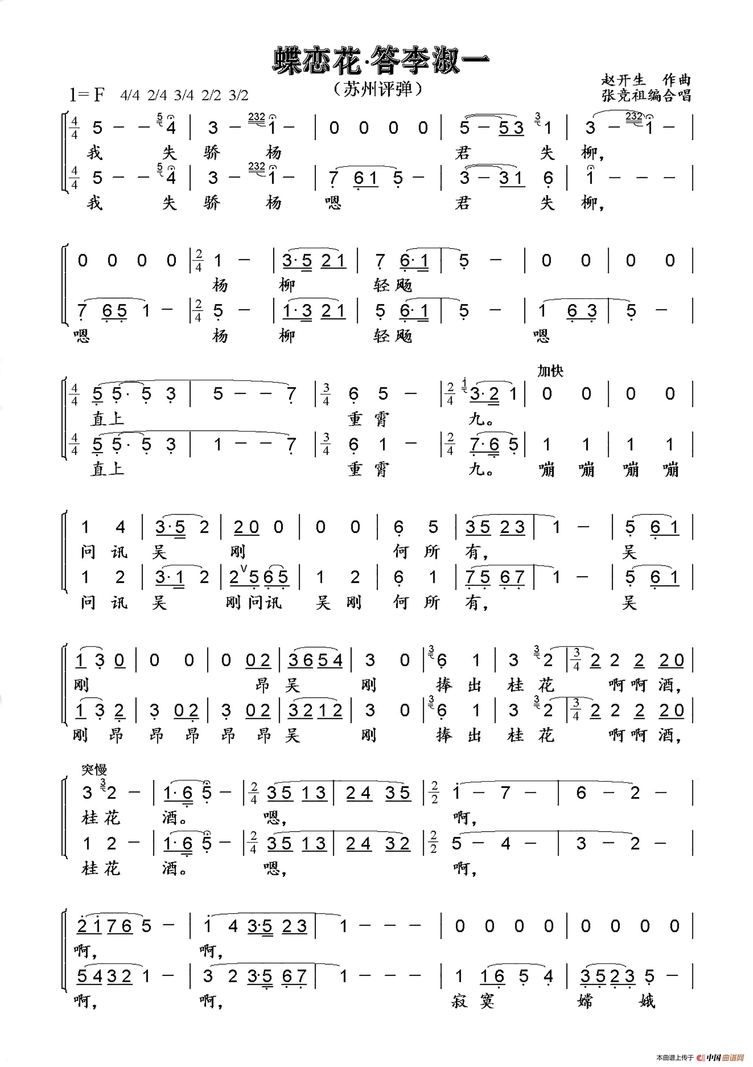 曲谱:蝶恋花·答李淑一(女声小合唱)(张竞祖改编)