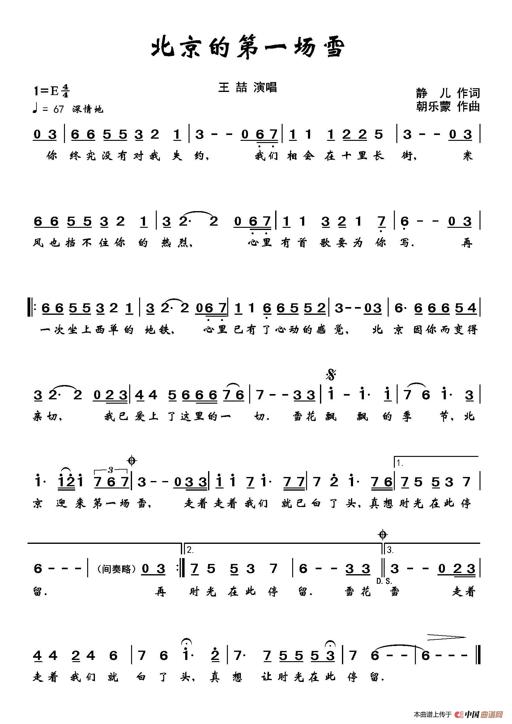 《北京的第一场雪》这首唯美的歌曲作品,由著名作曲家朝乐蒙作曲;词作家静儿作词;女高音歌唱家王喆演唱。歌曲旋律悠扬、典雅,极具时代气息,整首作品通过对简单的自然场景进行塑造和表现,挖掘自然中的真实,将人富有诗意的联想与自然物象进行结合,来表达内心的情感世界。通过旋律语言对雪的抒情和描写,以体现雪的包容万象,净化喧嚣和承载万物的艺术魅力。