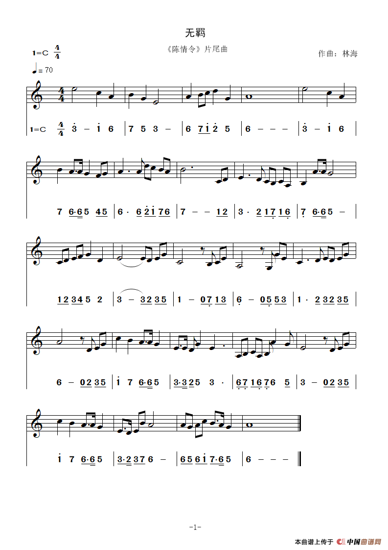曲谱:无羁(简谱+五线谱)C调(笛箫乐谱)