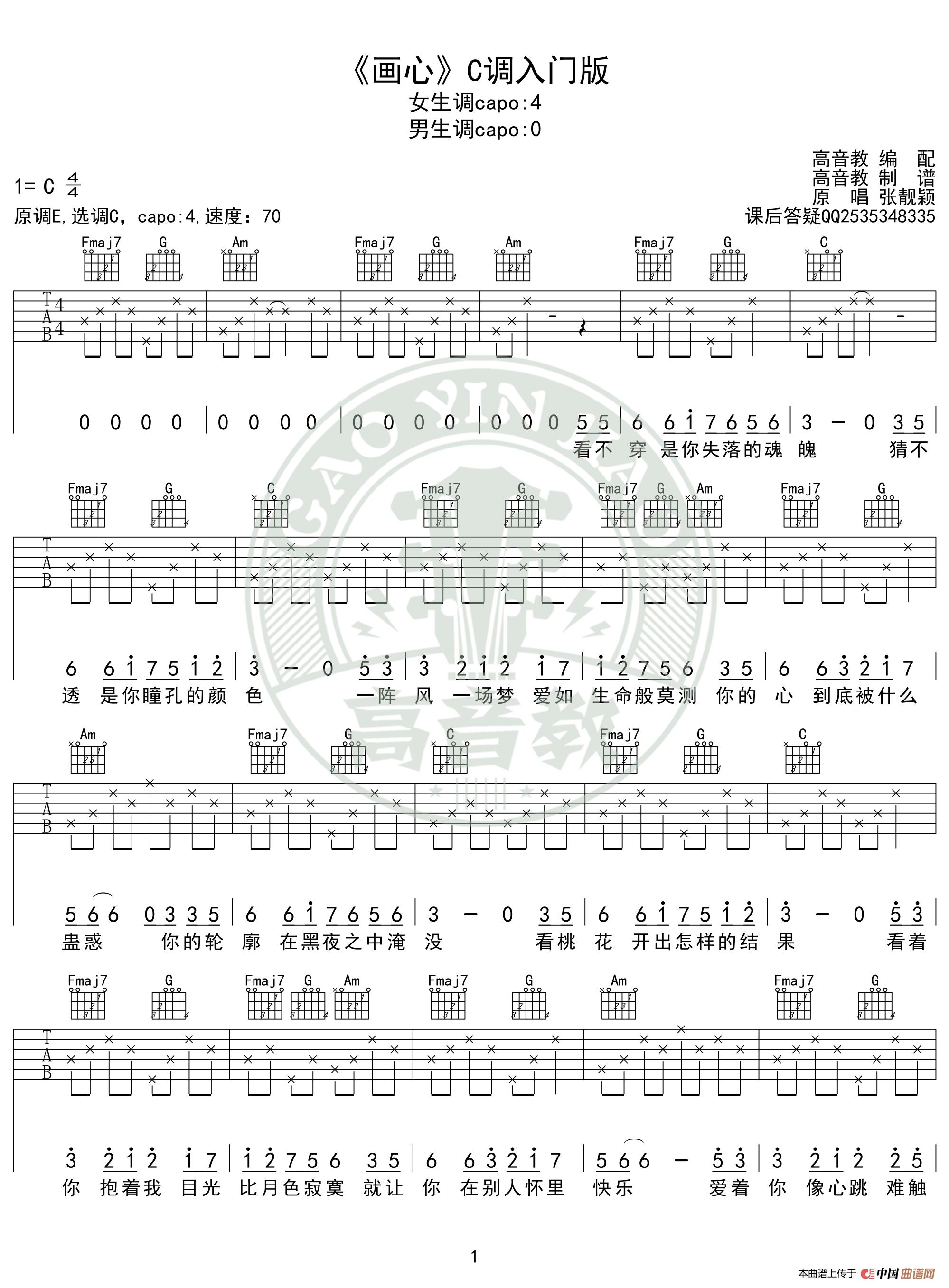 曲谱:《画心》吉他谱吉他弹唱教学C调入门版 高音教