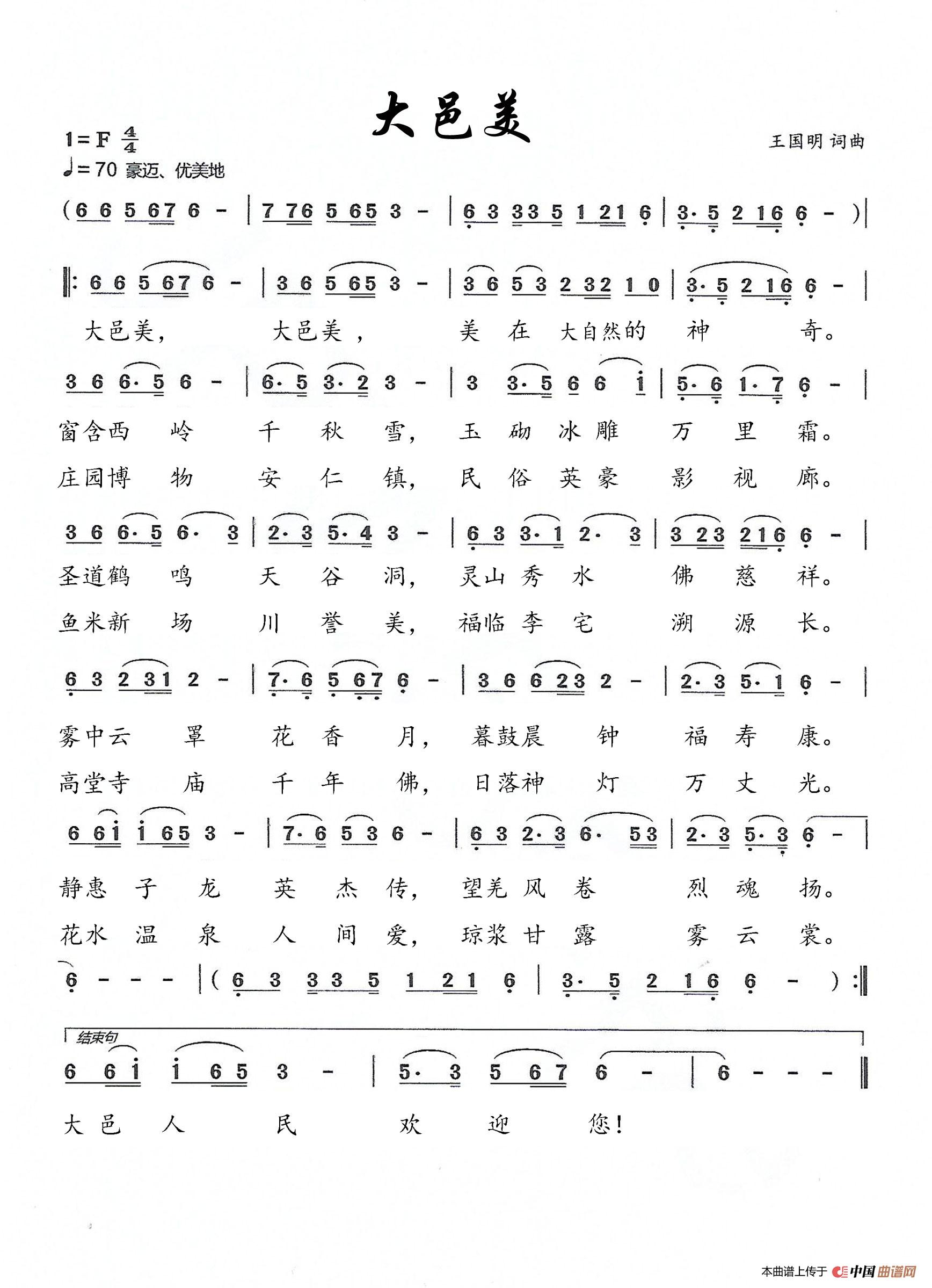 《大邑美》颂扬了大邑自然景观:刘氏庄园建川博物馆聚落西岭雪山新场古镇安仁古镇鹤鸣山道教文化花水湾温泉、雾中山、大邑子龙文化等。