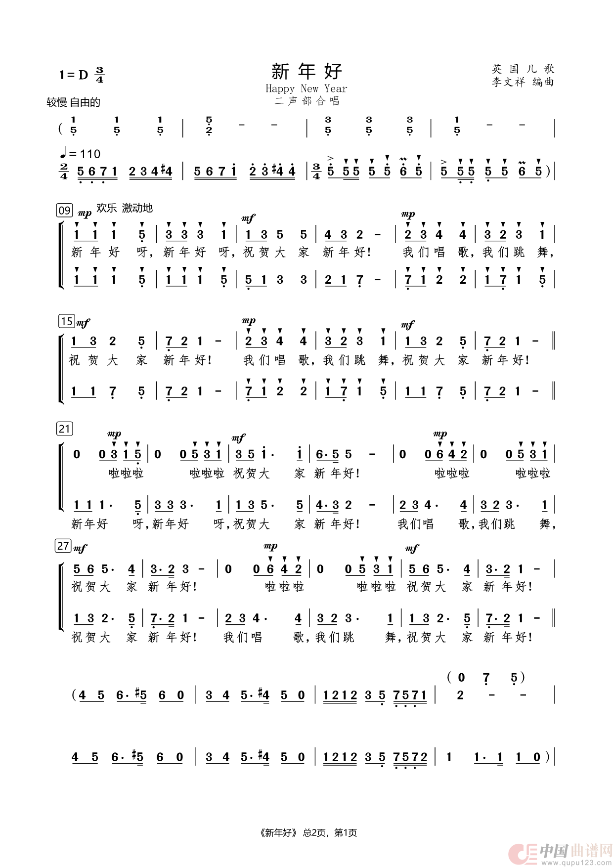 曲谱:新年好(二声部合唱)