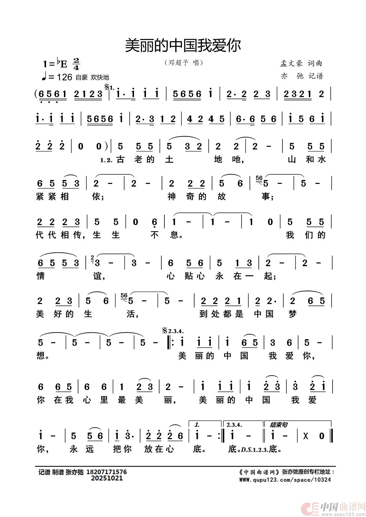 曲谱:美丽的中国我爱你(亦弛记谱)