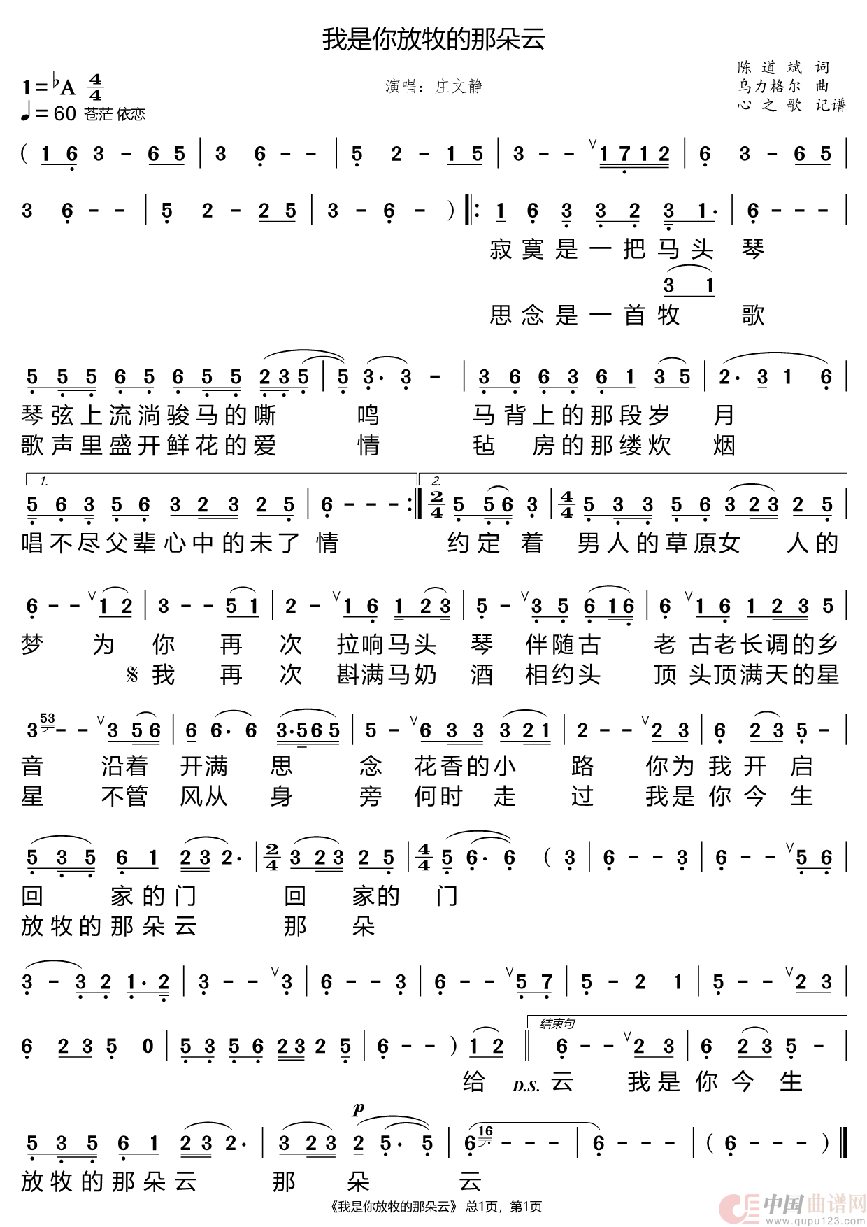 曲谱:我是你放牧的那朵云(庄文静)