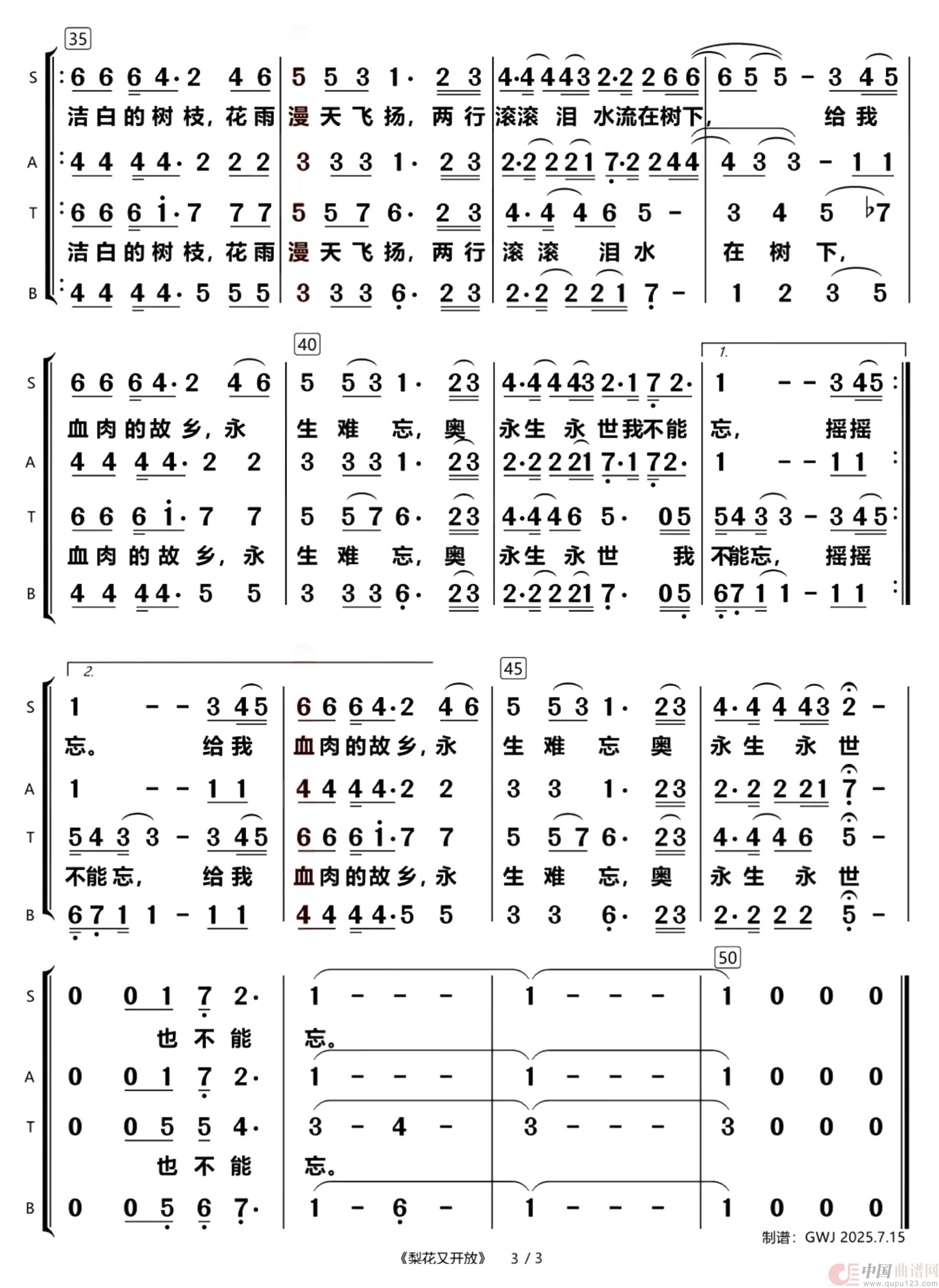 曲谱:梨花又开放(四声部合唱简谱)