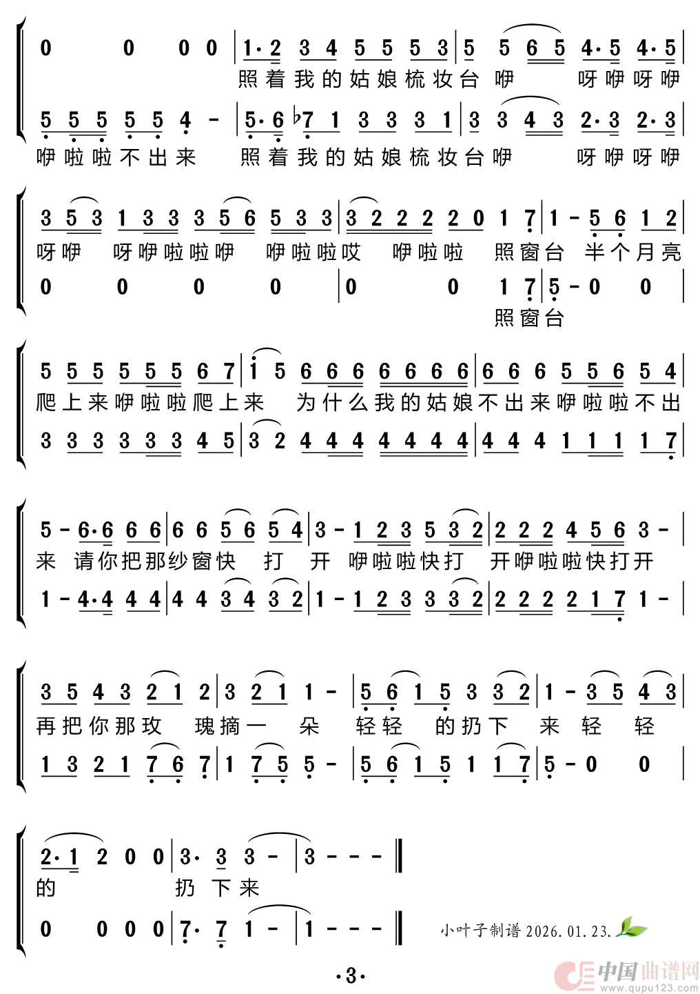 曲谱:半个月亮爬上来(二声部合唱简谱)